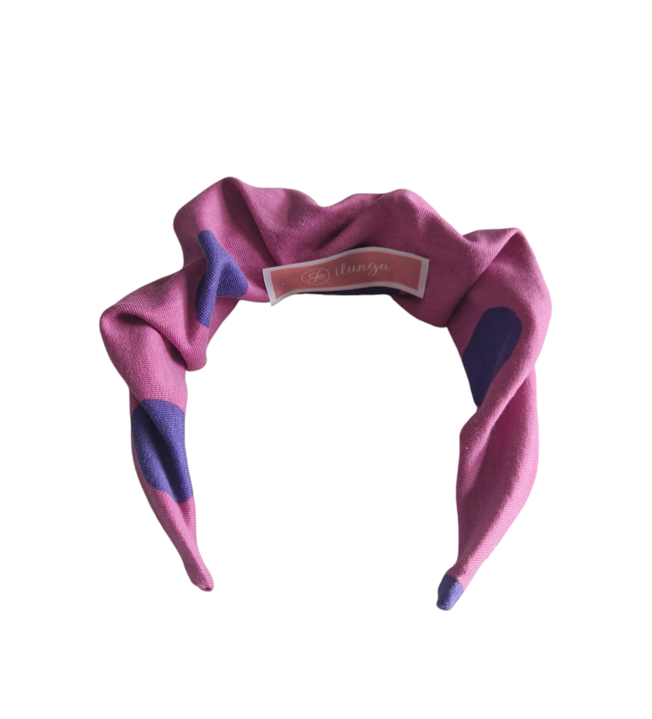Marszczona opaska w kolorze fuksja w duże fioletowe kropki. Opaska uszyta jest z dzianiny dresowej pętelki na plastikowej bazie.