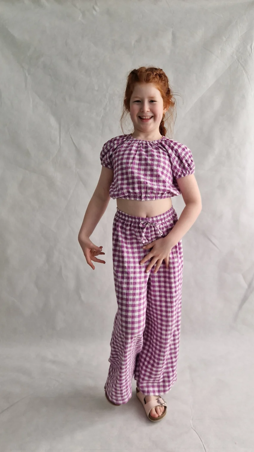Bluzeczka w kratkę fioletowo- biało, uszyta z tkaniny bawełnianej. Wykończona gumka przy dekolcie, na dole i przy rękawkach