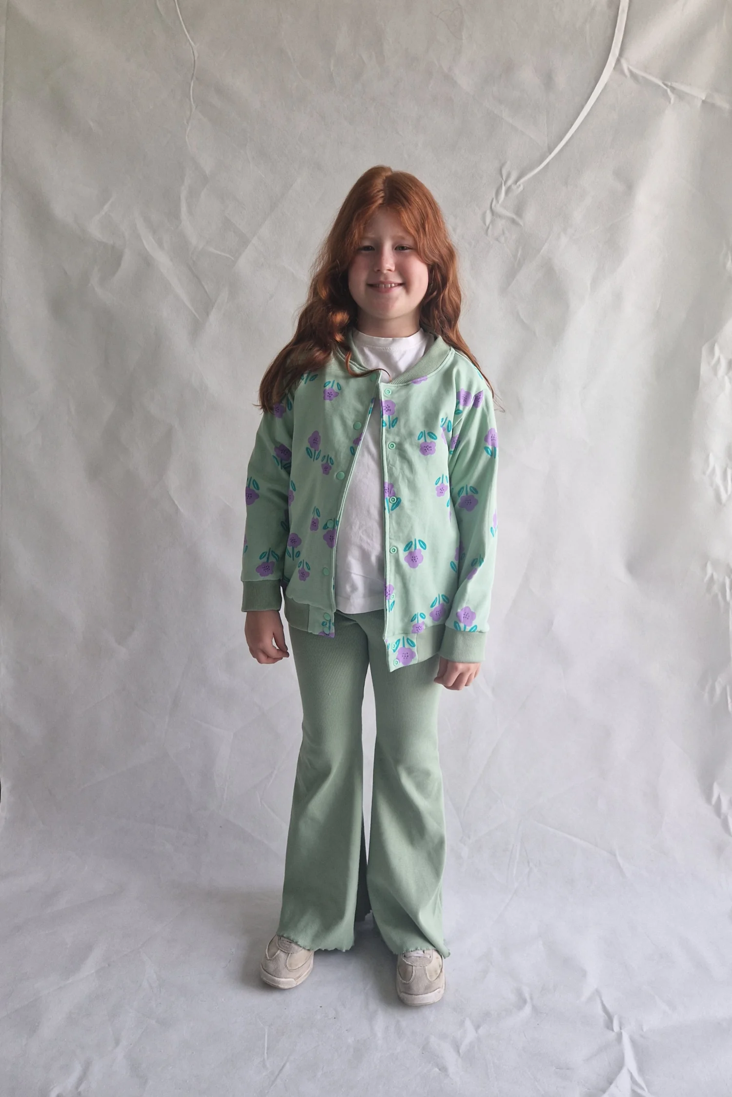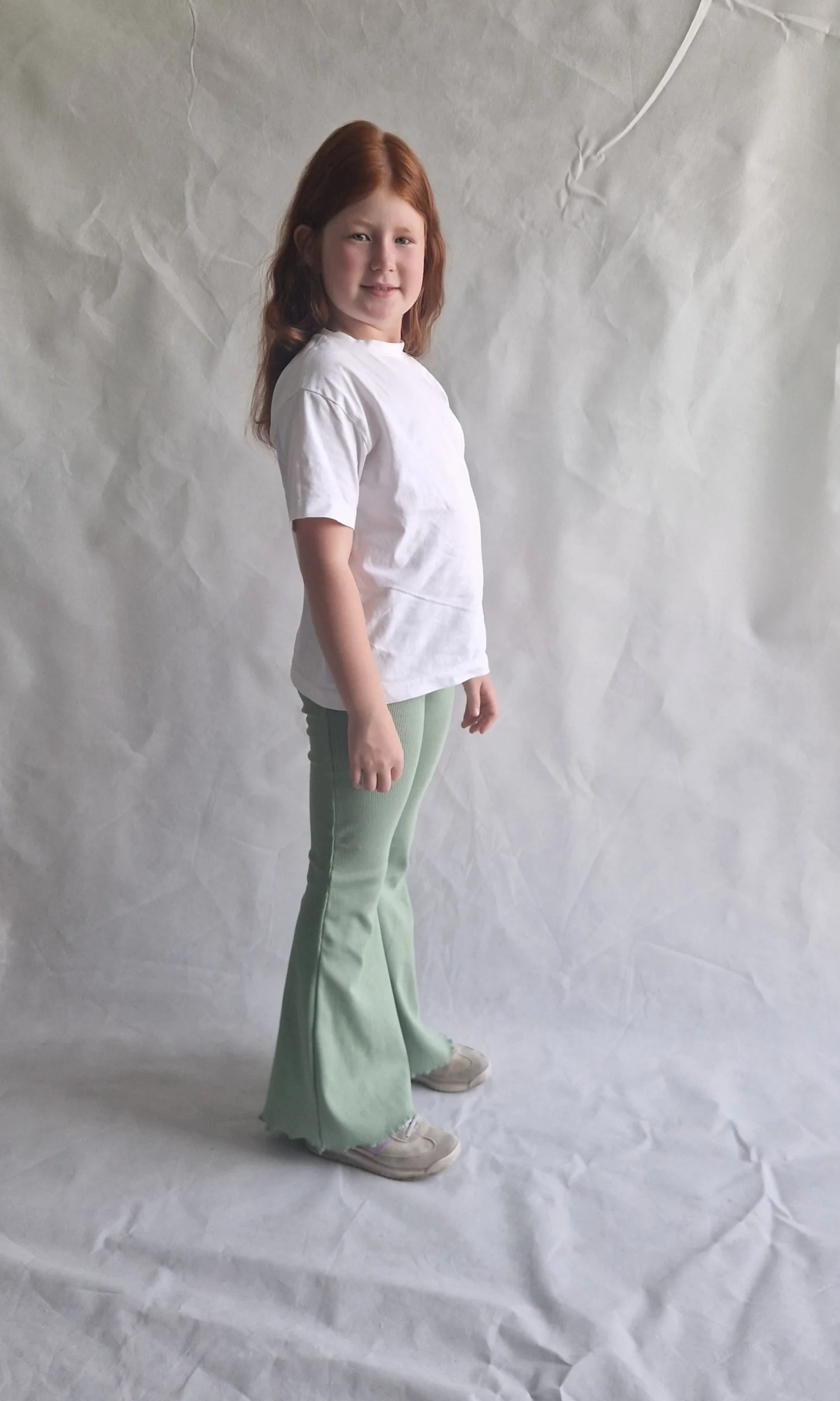Legginsy dzwony, uszyte z dziany prążek, w kolorze zielony - matcha. Spodnie sa mocne rozszerzane ( bardziej niz spodnie z nogawką flare), na dole wykończone mereżka w pasie mają gumkę.