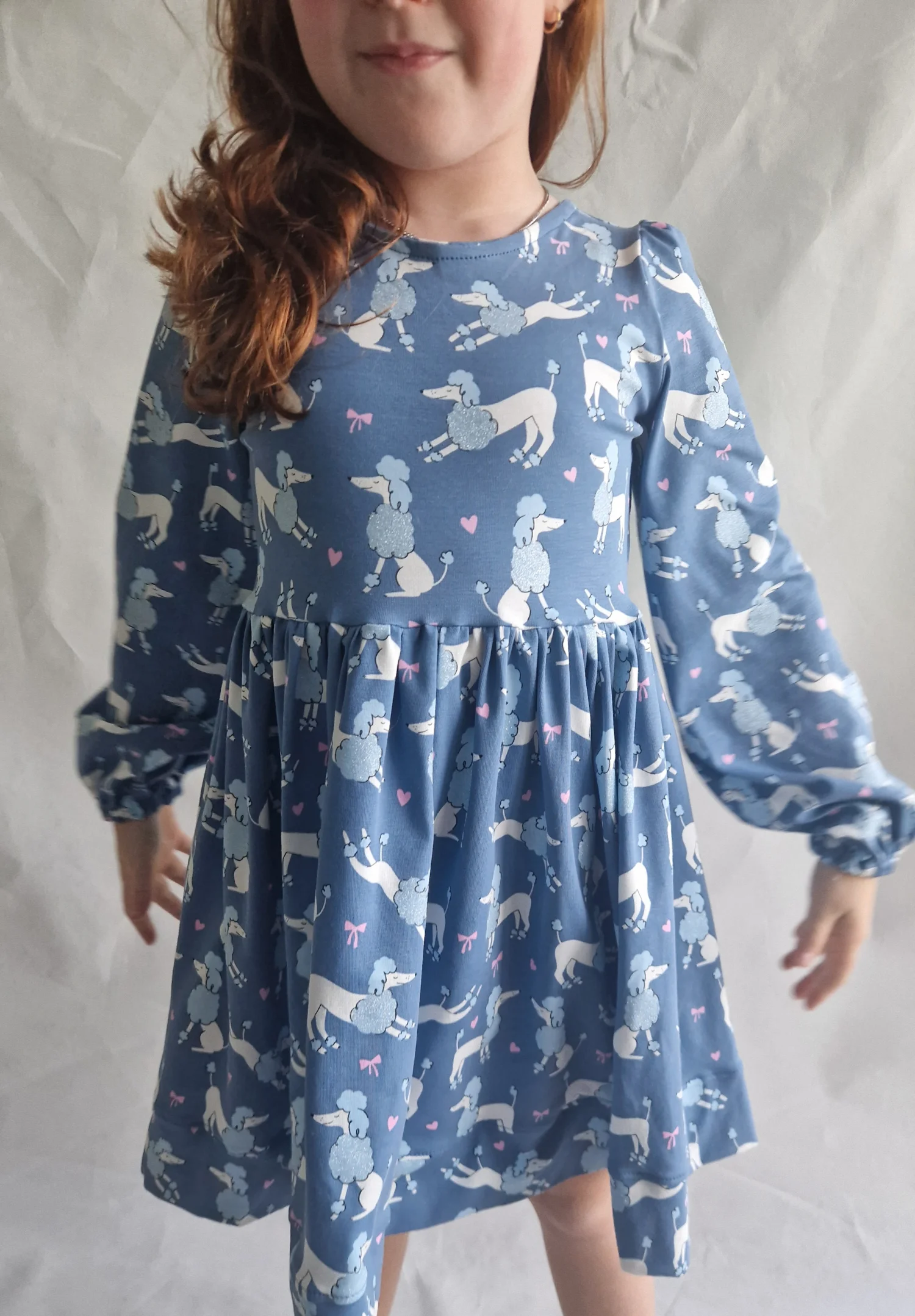 Sukienka Fern w uroczy wzór w pudelki z delikatnym brokatem w kolorze niebieskim. Sukienka ma długi rękaw wykończony gumeczką. Na dole wykończona jest grubą pliska. Fern to bardzo wygodna prosta sukienka na co dzień.
