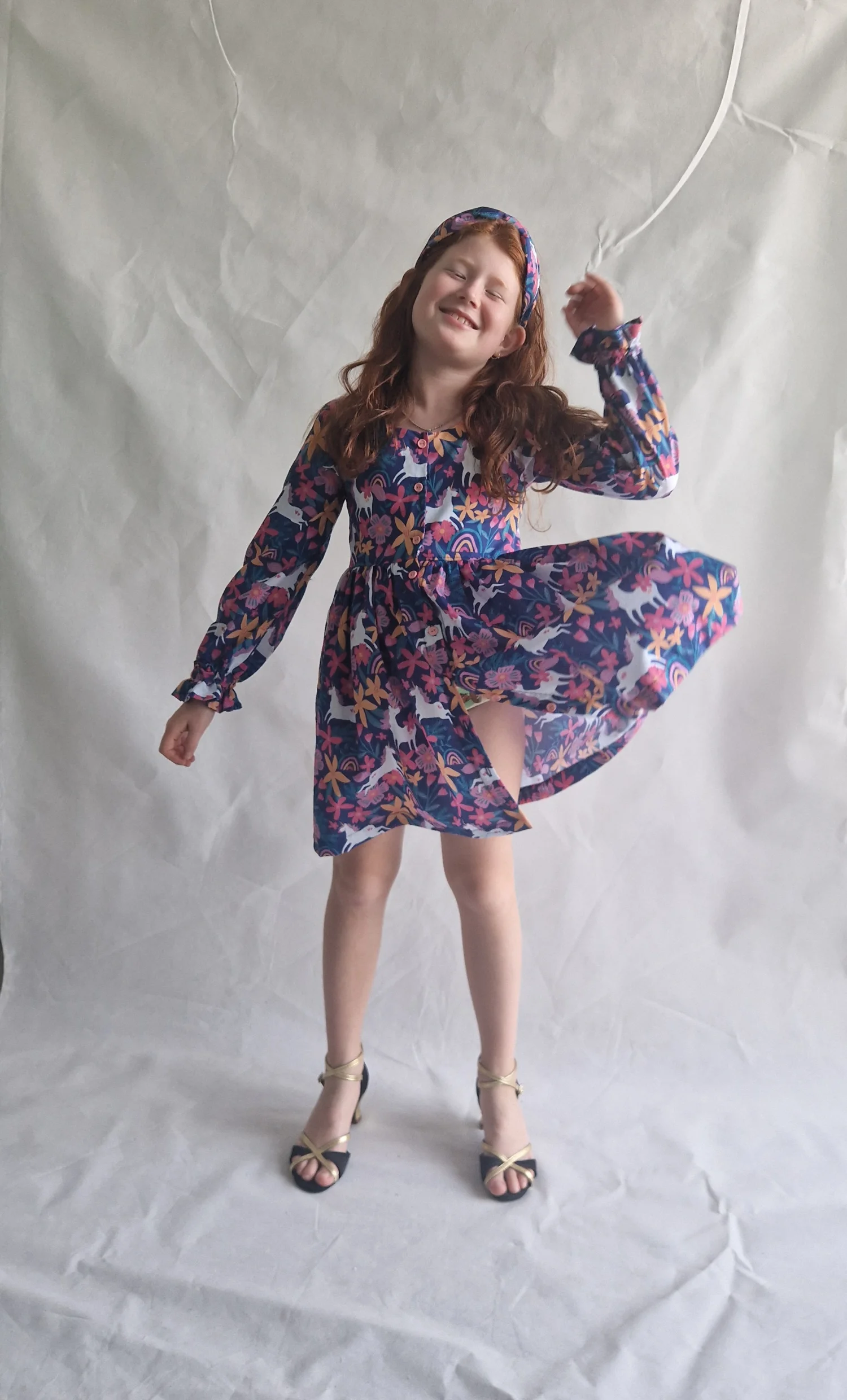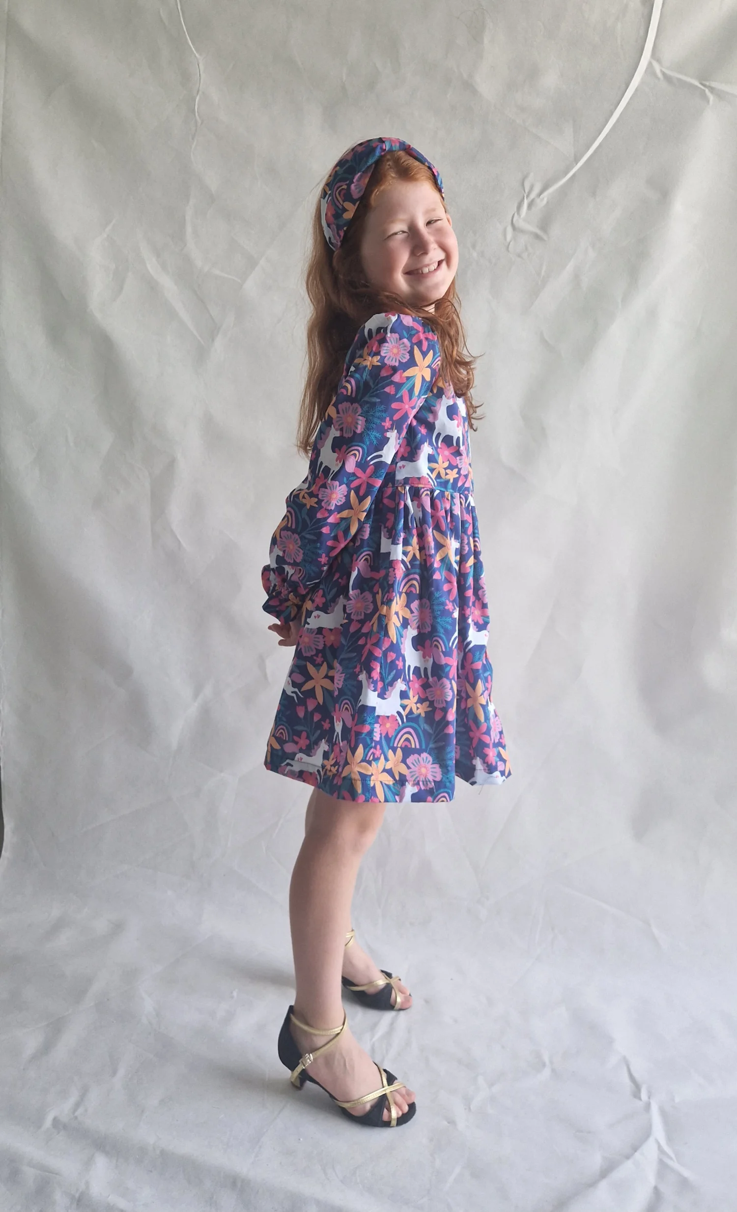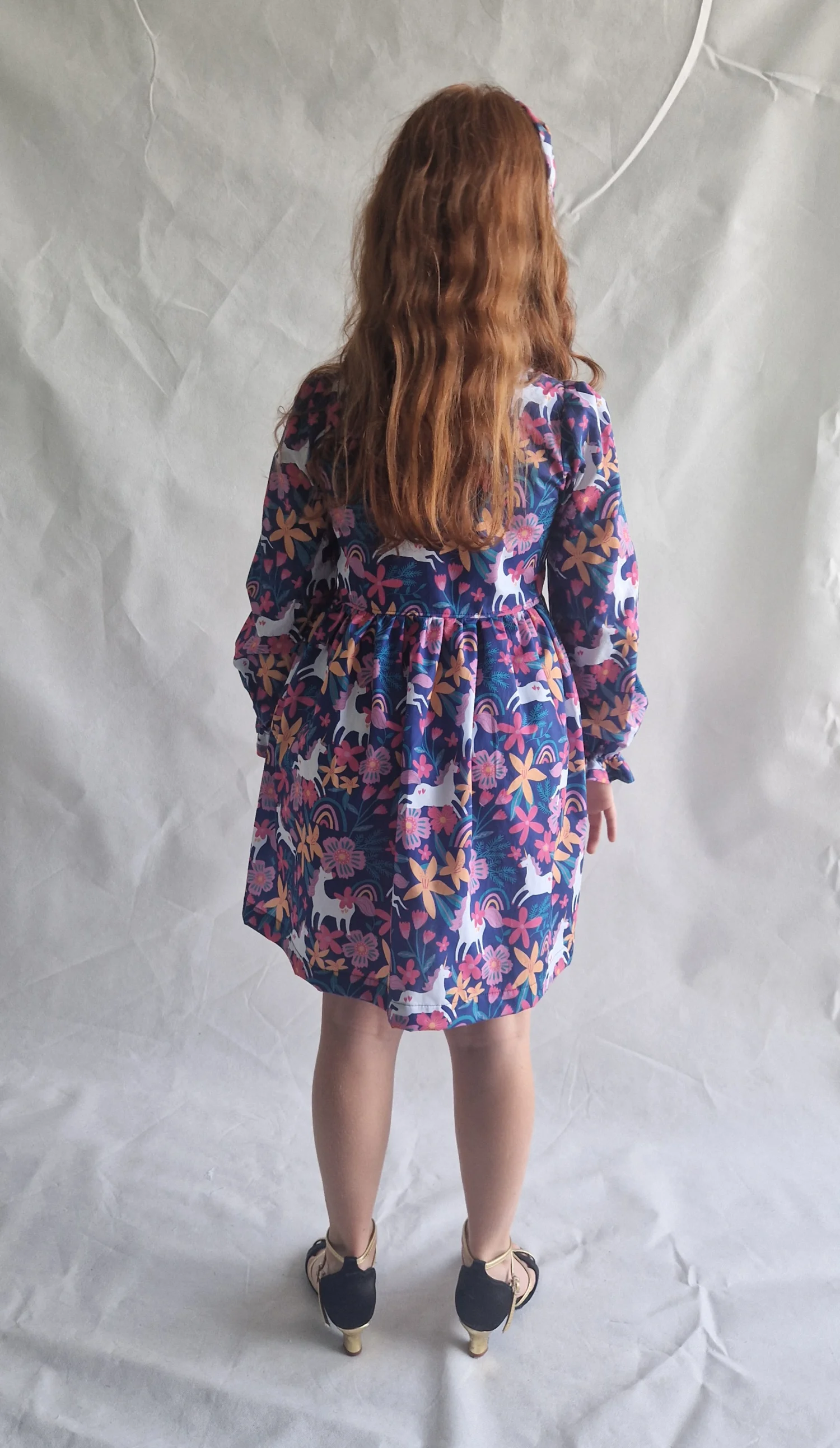 Urocza sukienka Rosemary w print jednorożce i kwiatki. Sukienka uszyta jest z tkaniny popeliny bawełnianej 100%, w kolorze niebieskim oraz wielokolorowe wzory.