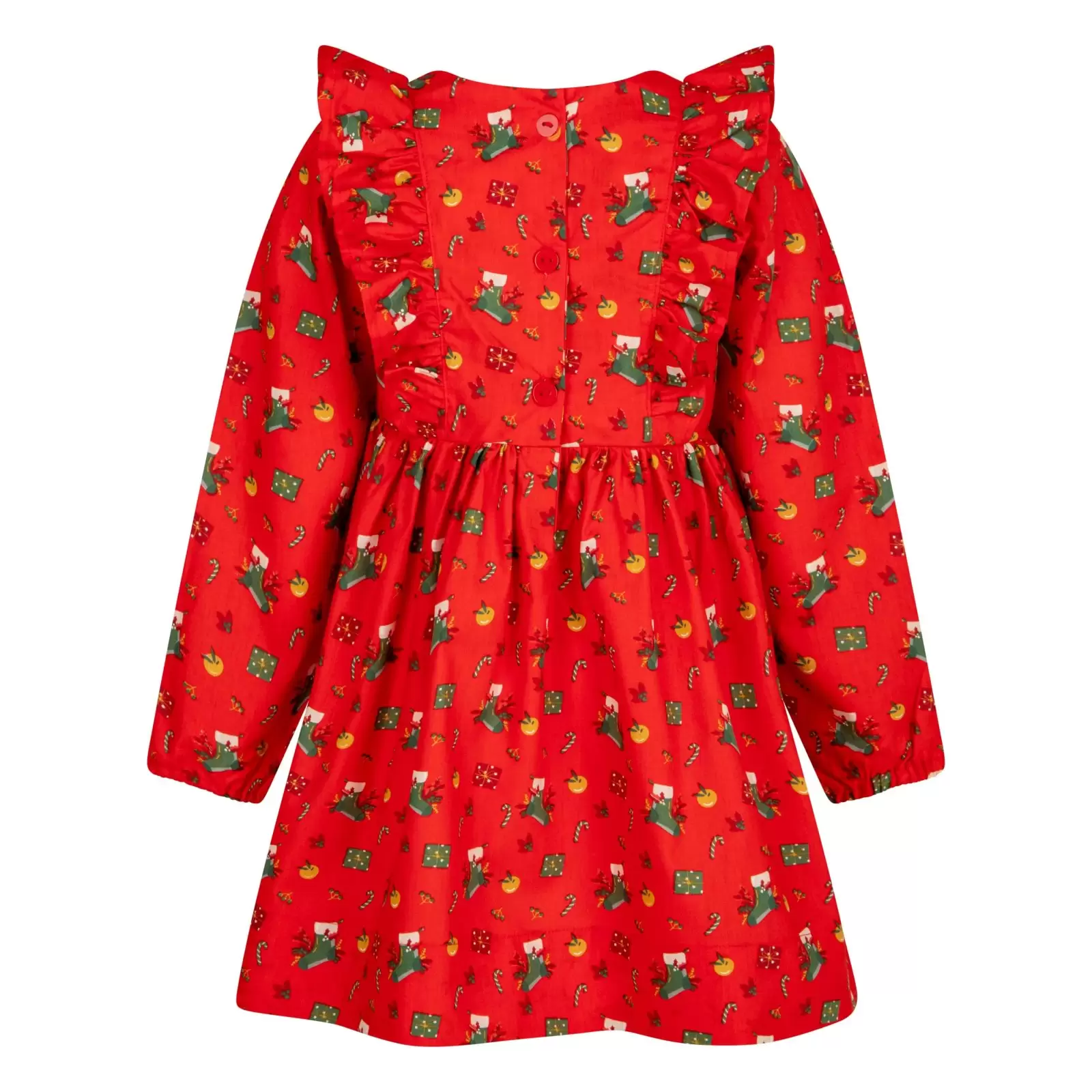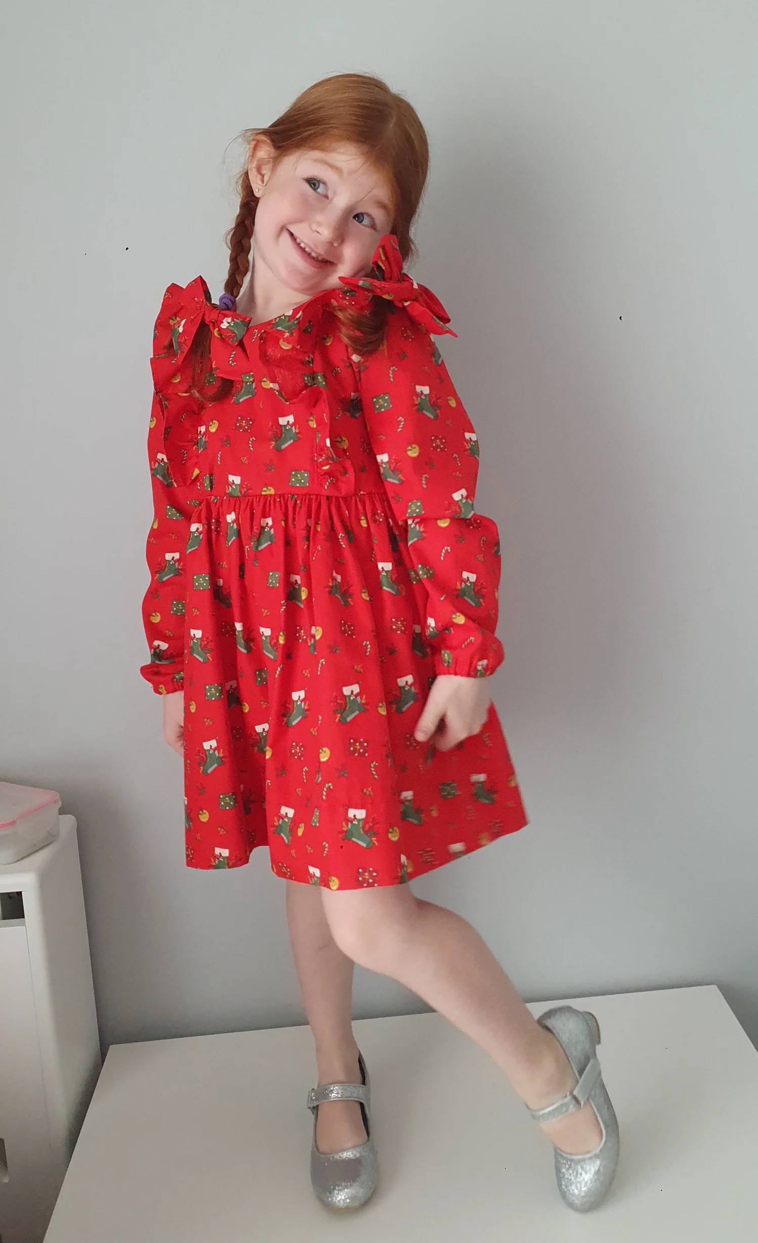 Piękna świąteczna sukienka Honeysuckle w kolorze czerwonym. Sukienka ma długi rękaw, wykończony gumką. Z przodu i tyłu ozdobna falbana. Dół sukienki prosty, z tyłu zapinana na guziczki. Sukienka uszyta z tkaniny bawełnianej 100% w świąteczny wzór