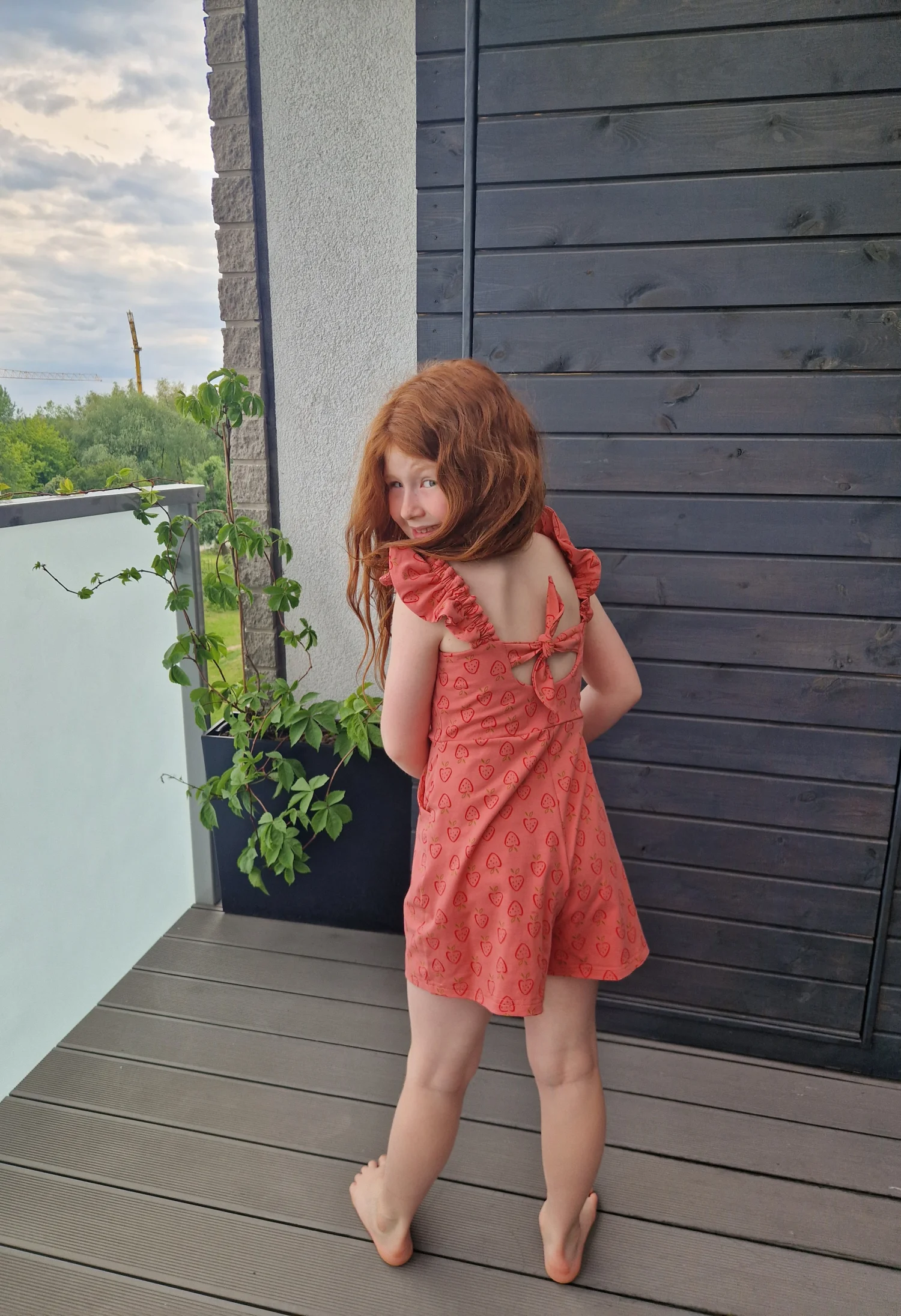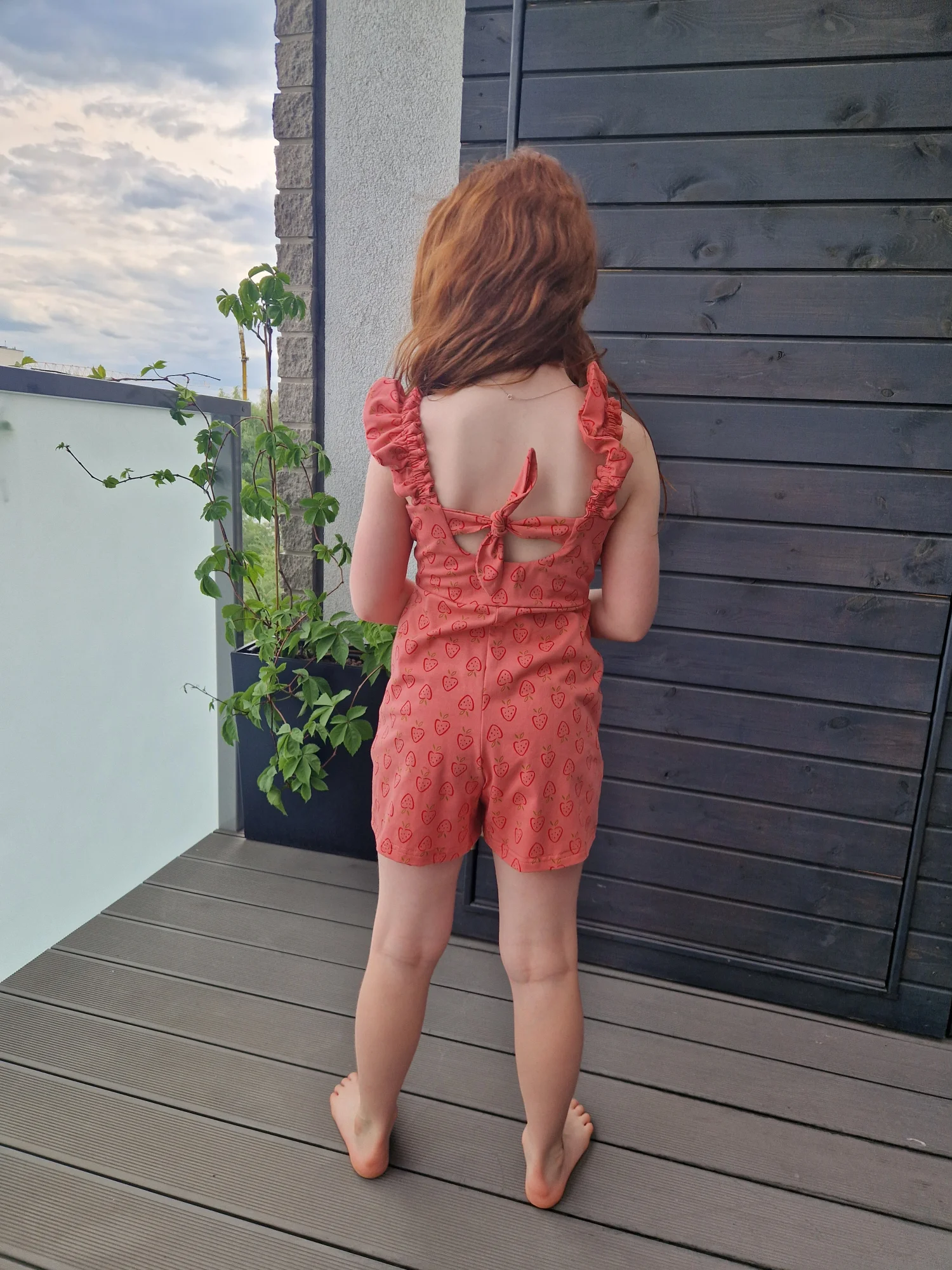 Ten uroczy kombinezon, będzie ulubionym strojem na lato! Jest mega łatwy w założeniu, ramiączka maja gumki, więc nie trzeba nic rozwiązywać żeby go zdjąć. Z tyły ma dodatkowe urocze wiązanie.