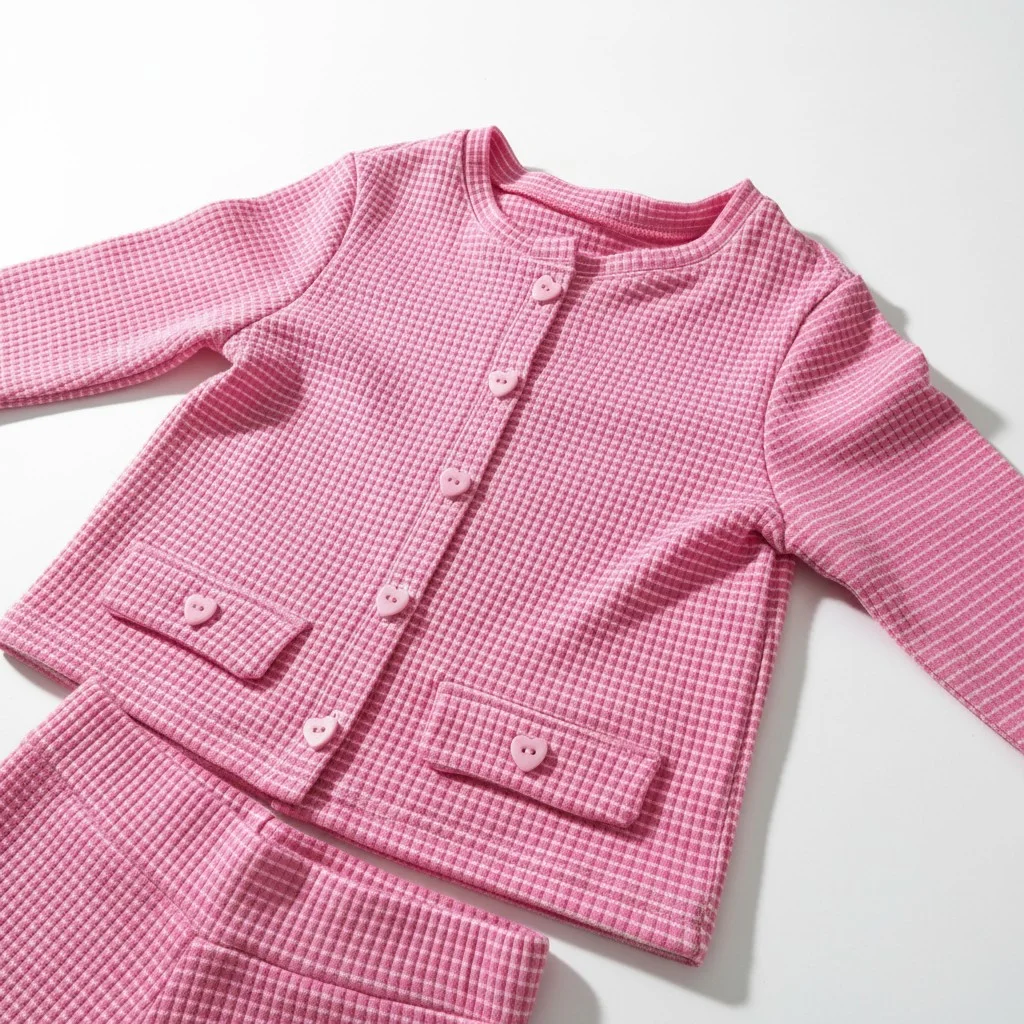 Kardigan zapinany jest na guziczki, ma długi rękaw i tworzy piękny komplecik z legginsami flare w tym samym kolorze