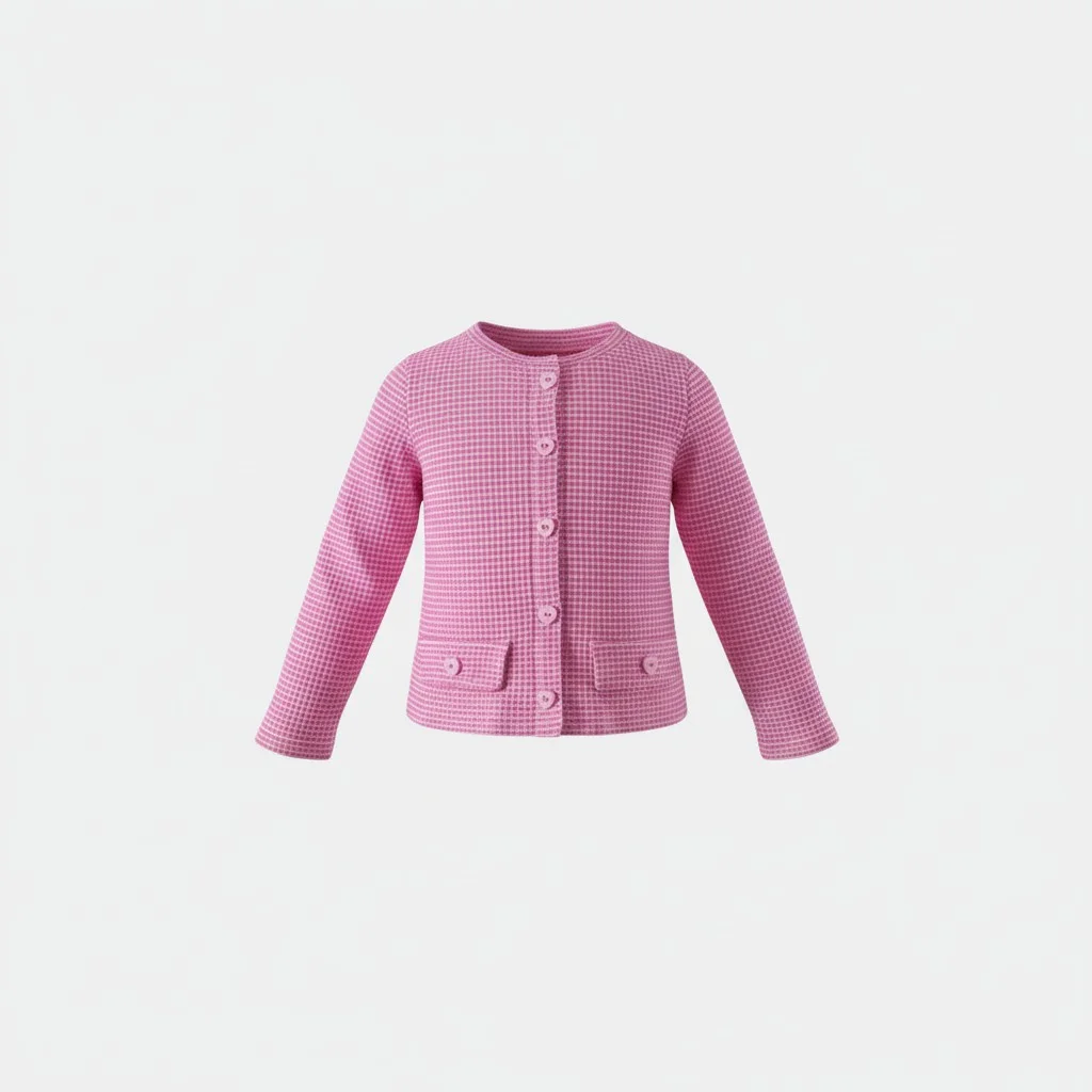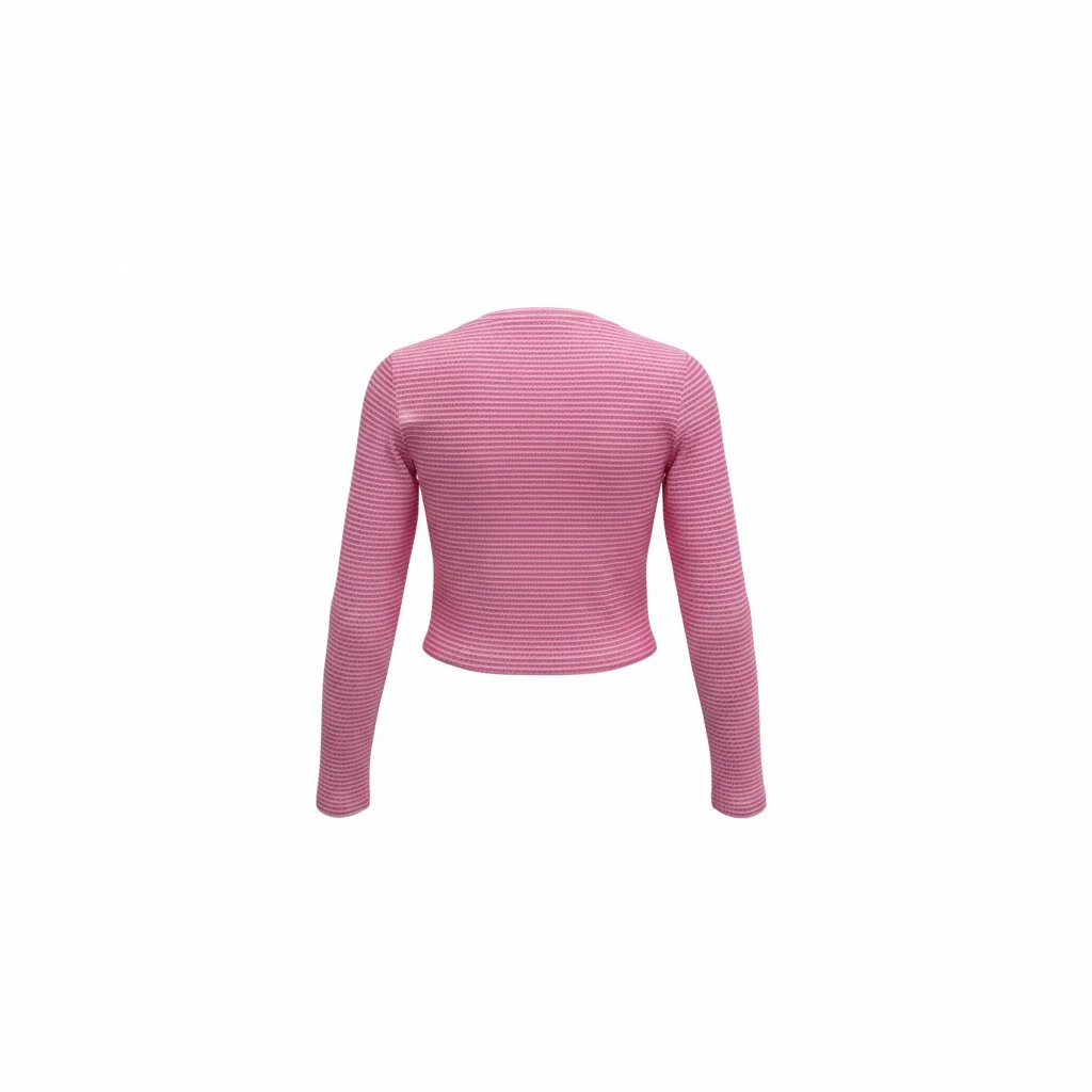 Różowy kardigan, uszyty z dzianiny prążek w delikatne białe paseczki.