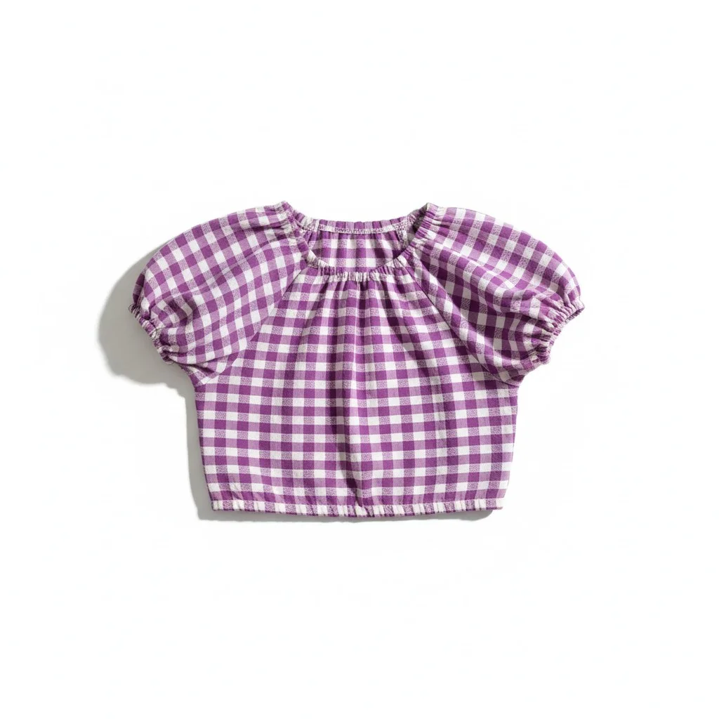 Długie spodnie z tkaniny bawełnianej w kratkę fioletowo- białą. Spodnie maja szeroką nogawkę i gumkę w pasie.