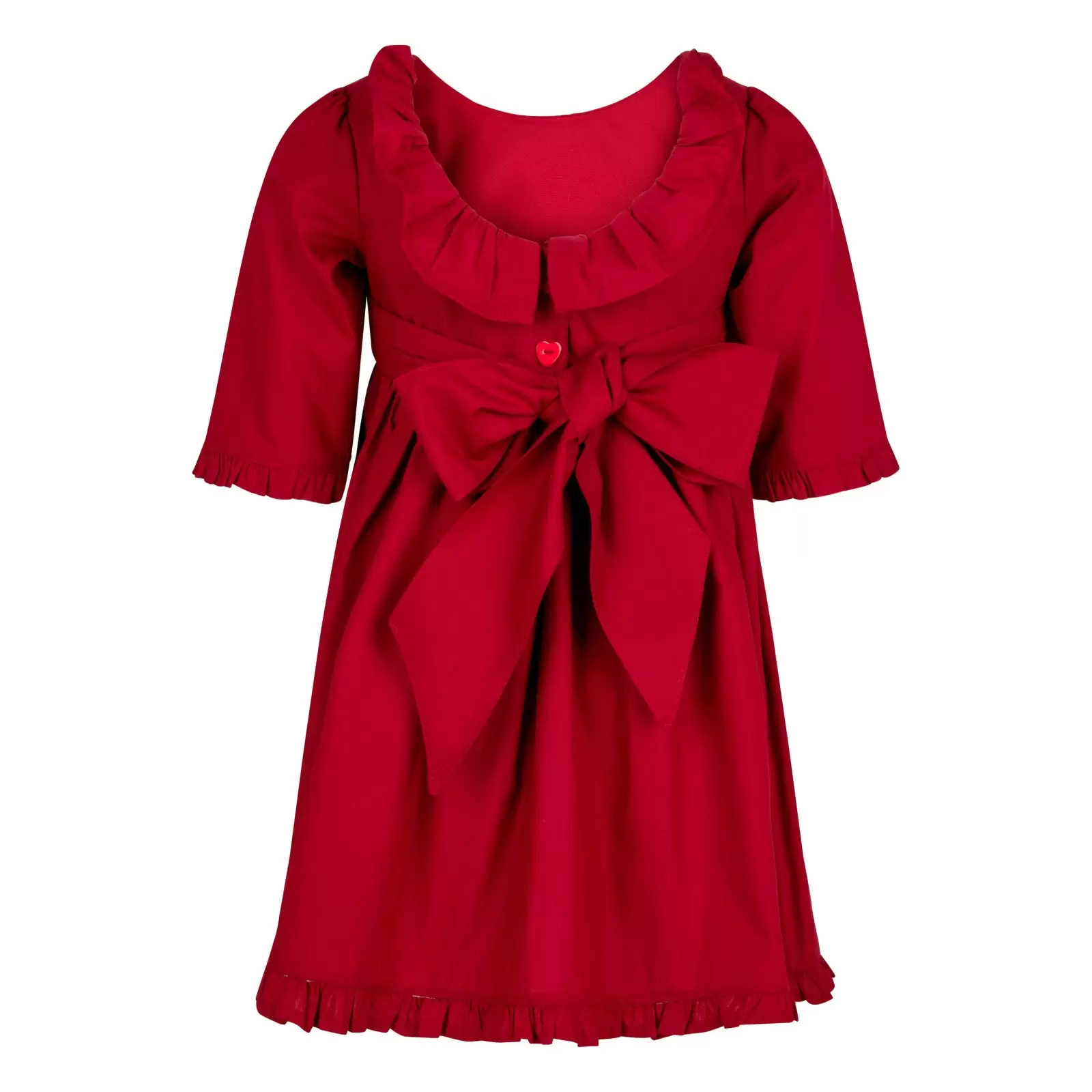 Świąteczna sukienka w kolorze ciemnej czerwieni. Bardzo elegancka sukienka, uszyta z tkaniny bawełnianej, rękawki, dół i tył wykończone falbanka, z tyłu zapinana na dwa guziczki, z tyłu ozdobna kokarda.
