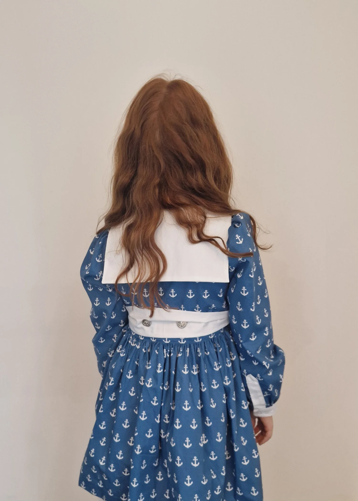 Katherina to sukienka z długim rękawem wykończonym białymi mankietami z guziczkiem sukienka ma także kołnierz sailor w kolorze białym. Zapinana jest z przodu na trzy guziczki, oraz ma tasiemkę która można zawiązać na supełek lub kokardkę Długość sukienki przed kolanka.