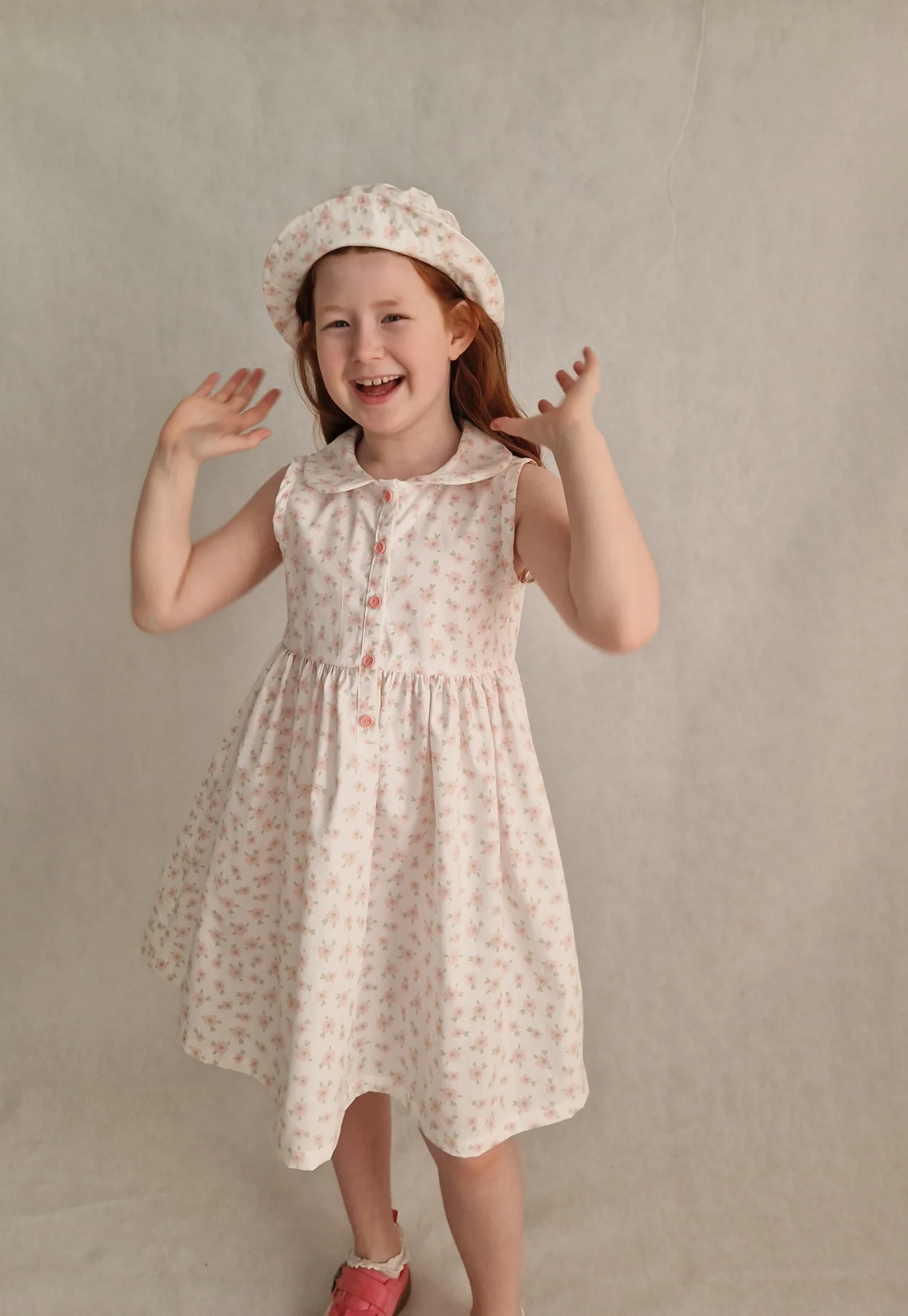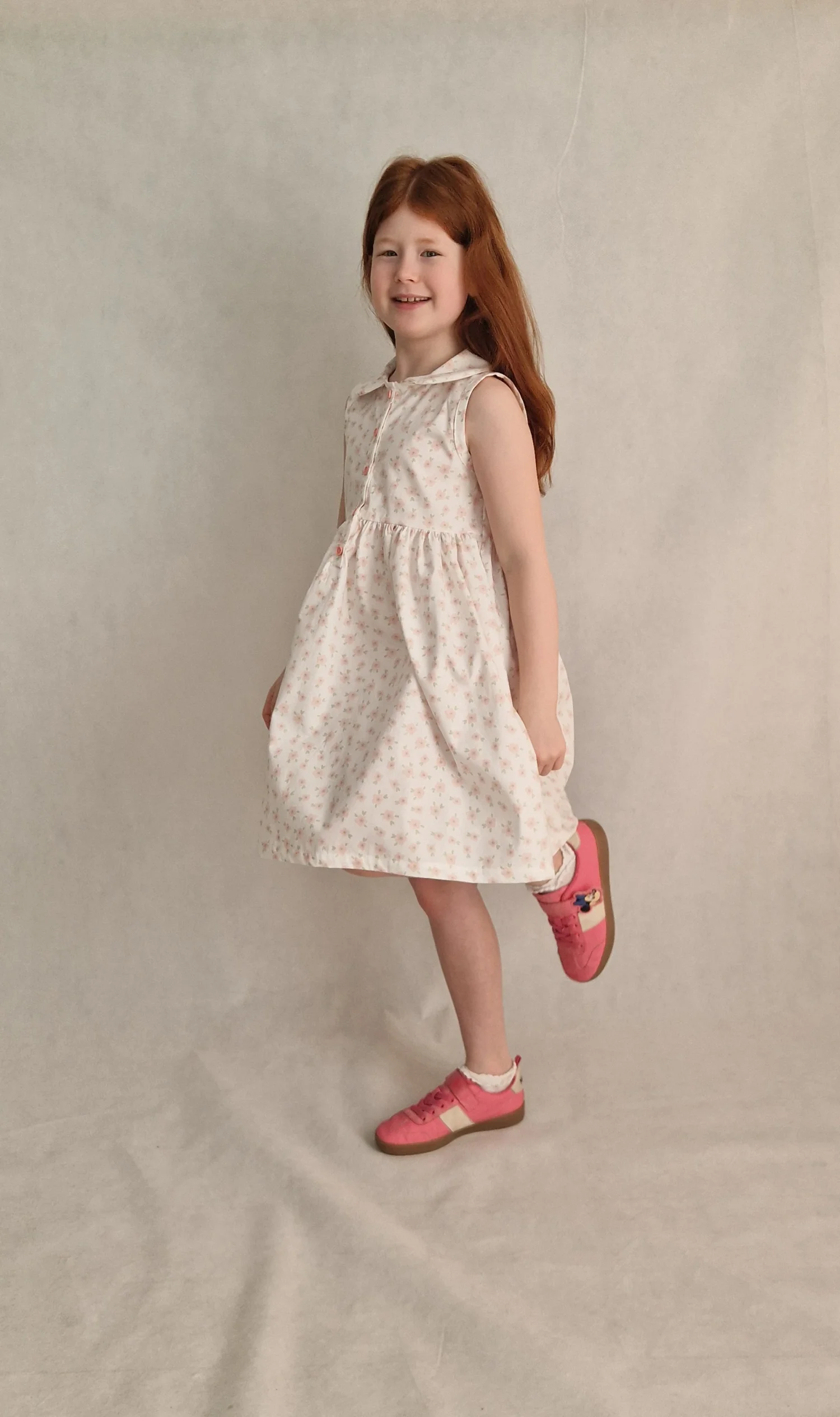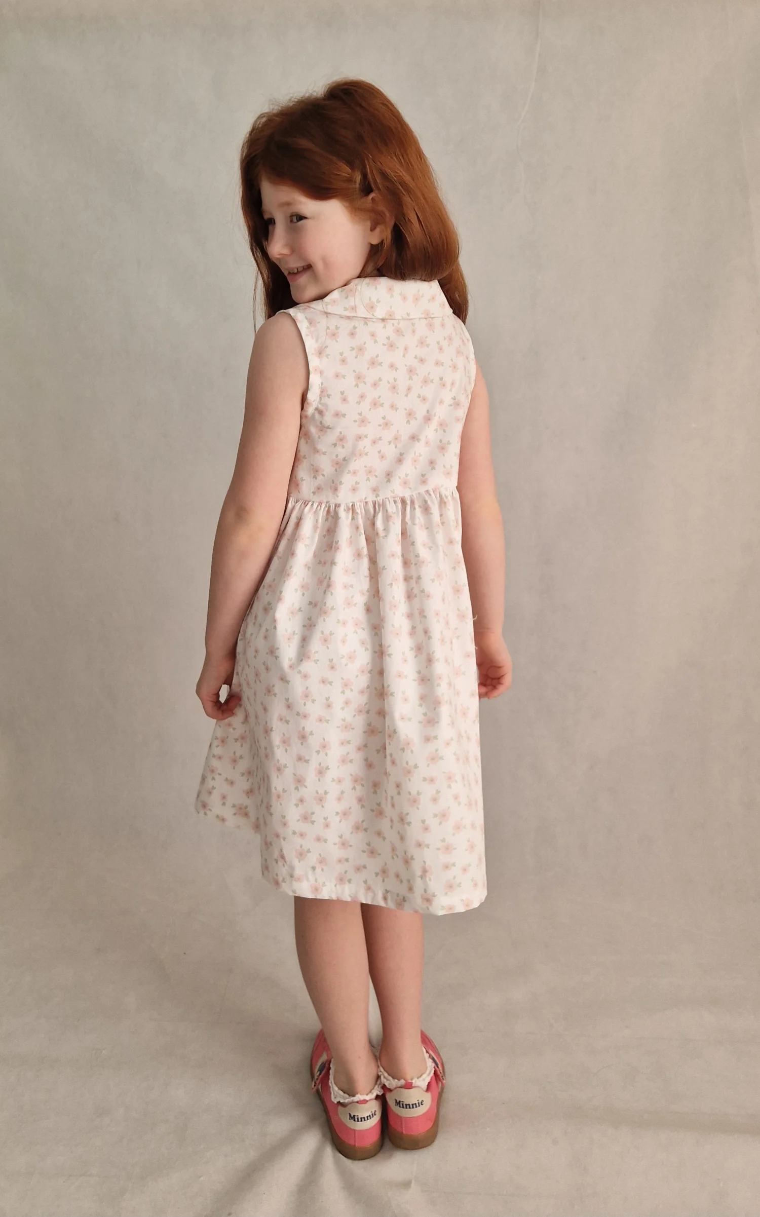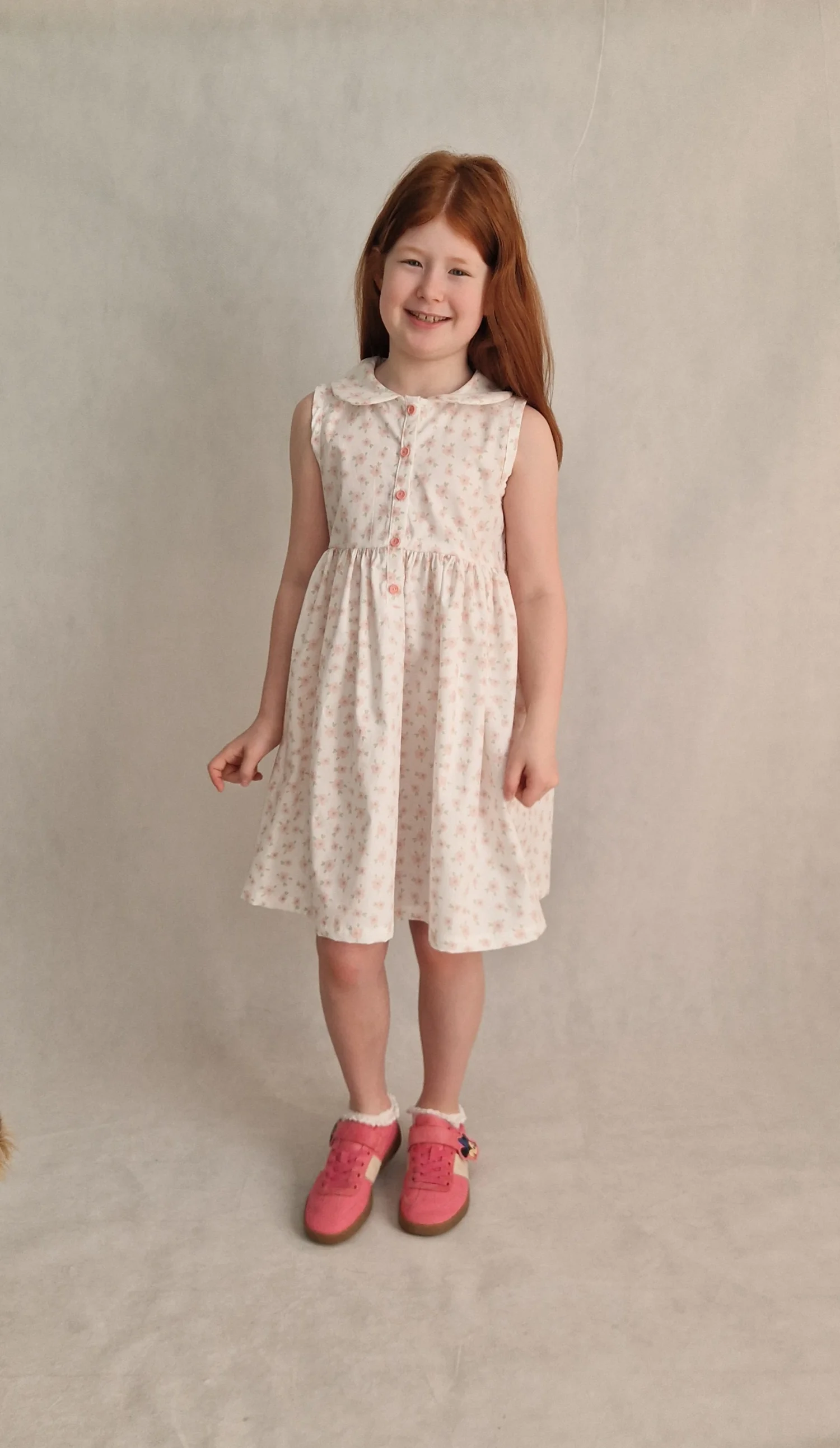 Sukienka uszyta jest z bawełny 100%, ma kołnierzyk i zapinana jest z przodu na różowe guziczki. Sukienka jest bez rękawków, wykończona lamówka.